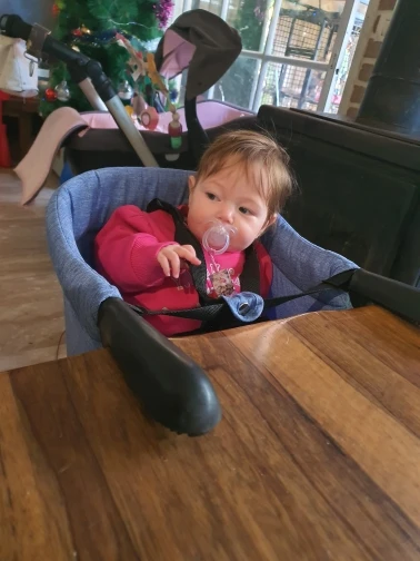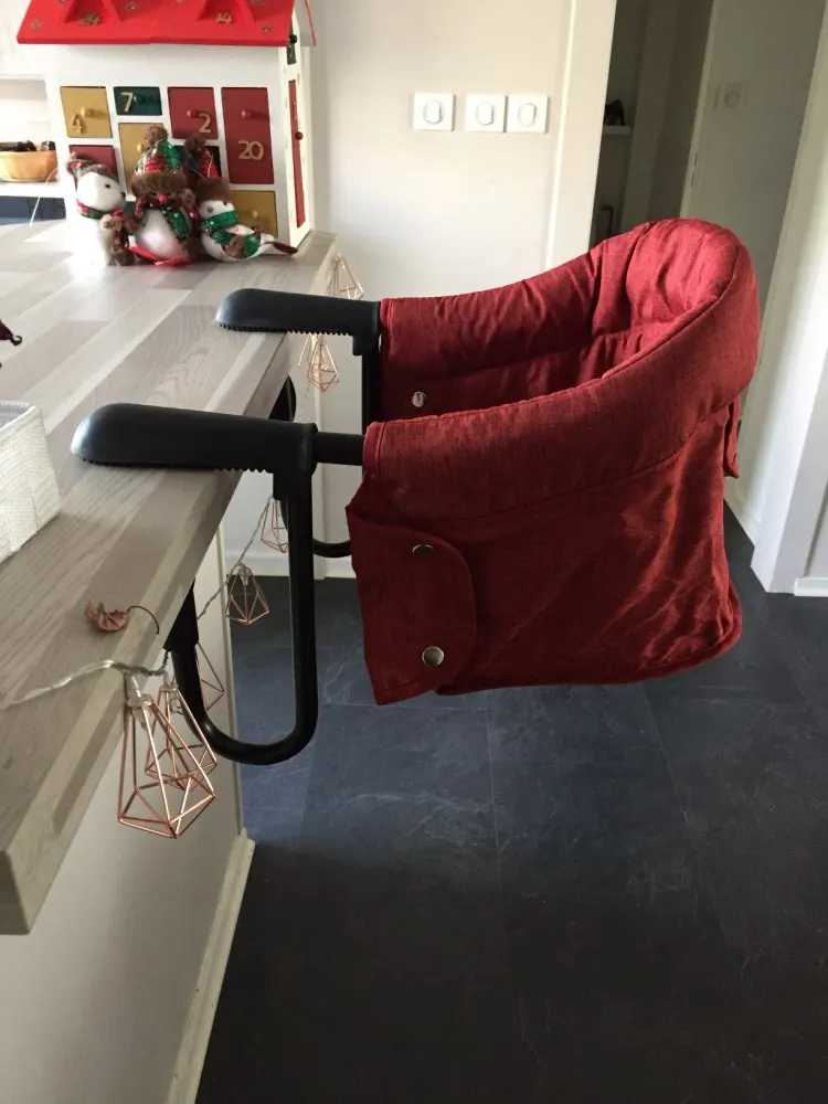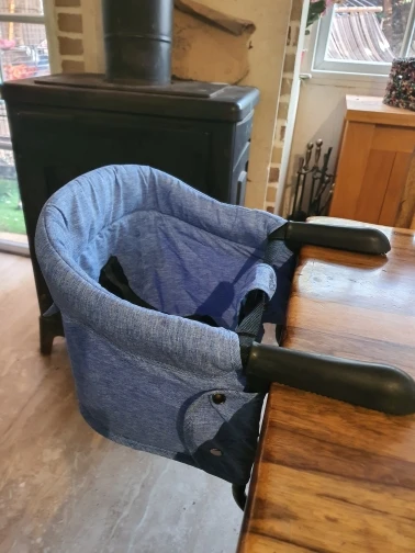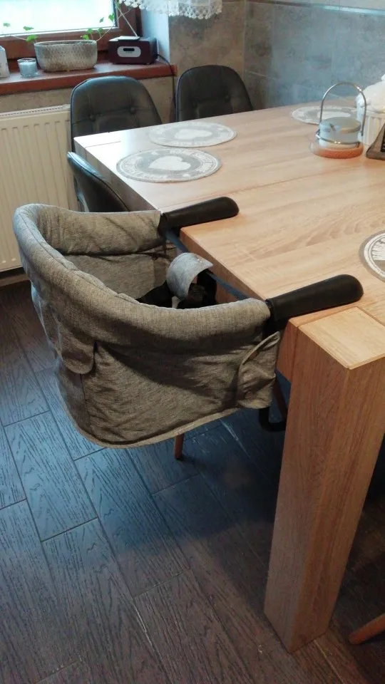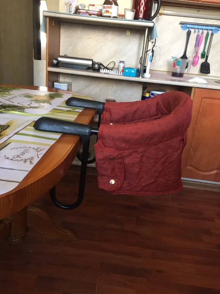 Features: Folds flat for easy storage and travel Double-locking attachment works easily on most tables Safety is key with a 3-point safety harness. Rubberized grips won't mark tables or pinch fingers Stable,Safe,Washable,Durable